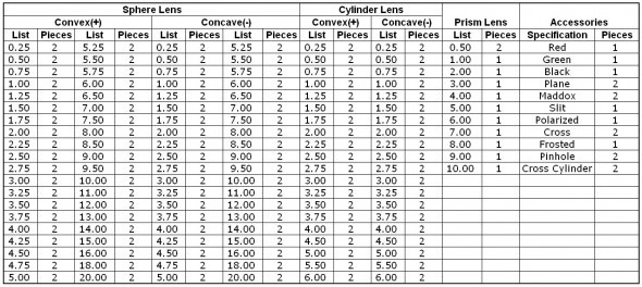 1Este conjunto de lentes de ensaio vem com 266 lentes de ensaio, toda a potência em 2pcs ((1par),